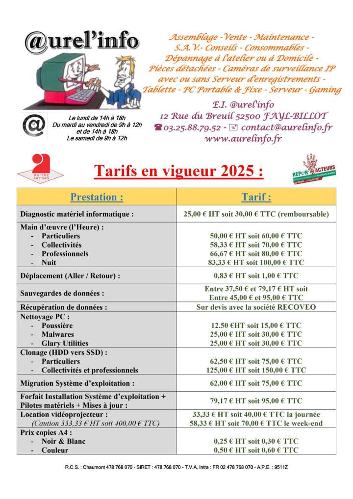 Découvrez les différents tarifs et forfaits des prestations d’@UREL'INFO